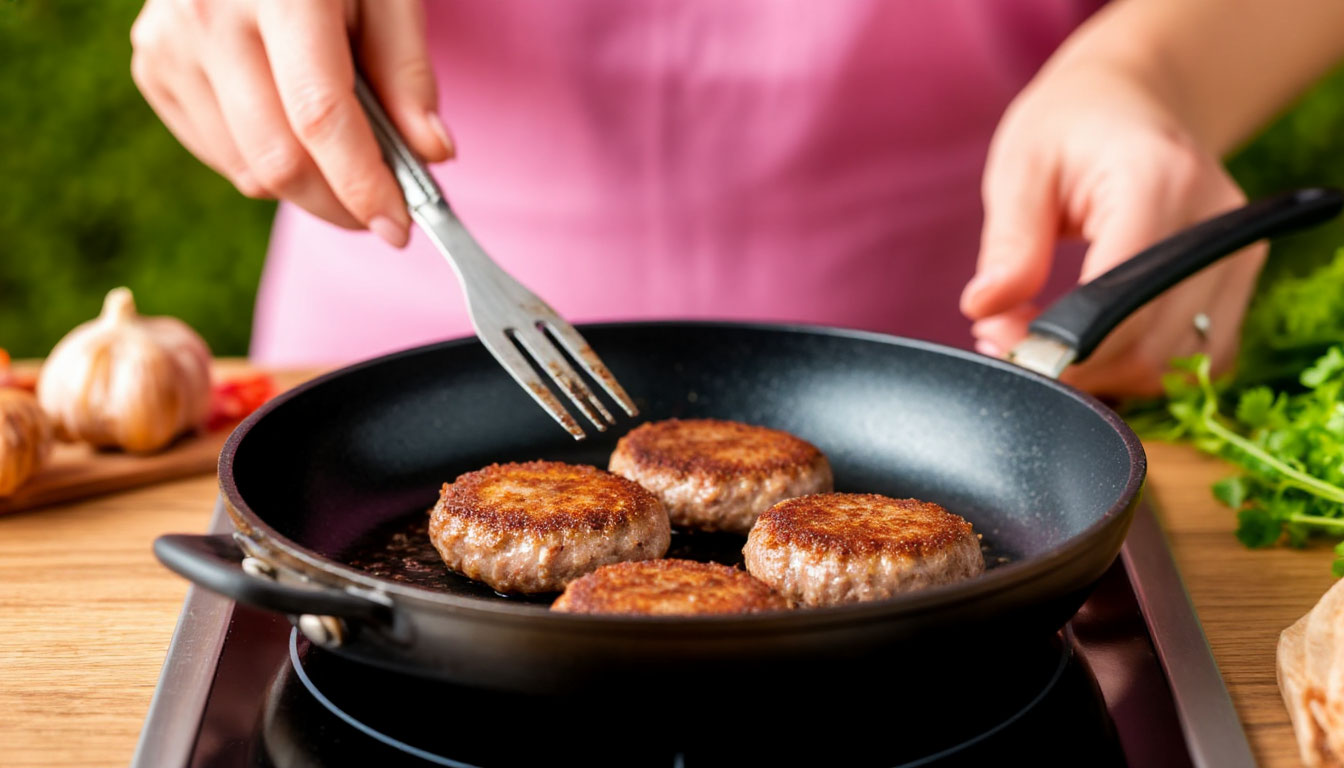 Этот способ подходит для повседневного использования. Обжарьте котлеты с двух сторон до золотистой корочки (5–6 минут). Затем налейте полстакана кипятка, накройте крышкой и томите на слабом огне 5–10 минут. Для пикантности используйте рассол, а для насыщенного аромата — мясной, овощной или грибной бульон.