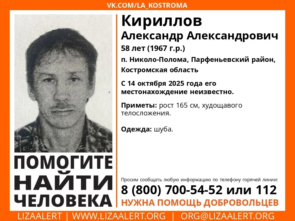 С 14 октября 2025 года пропал Кириллов Александр Александрович, его местонахождение остается неизвестным.