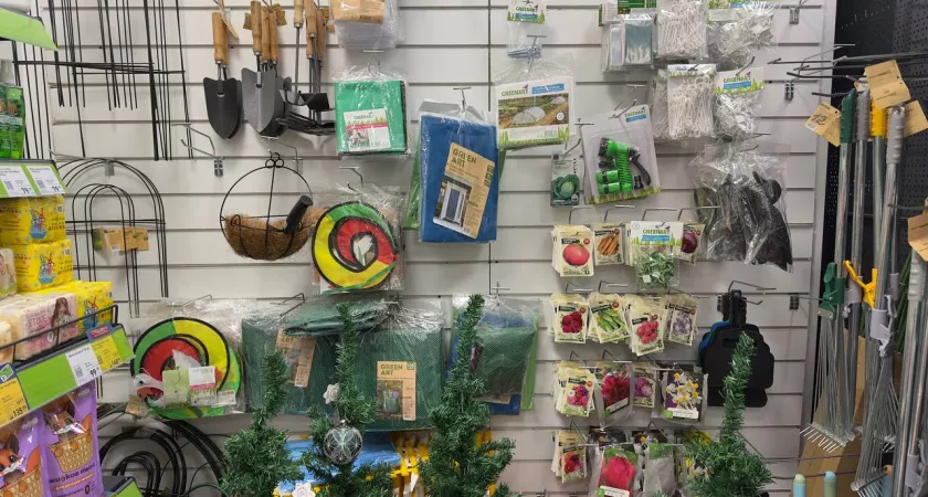 Отдельный восторг — стеллаж с яркими покатиками семян. Томаты, огурцы, редис — всё аккуратно, с бирками.