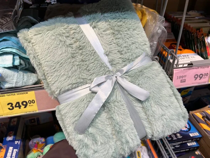 А вот пушистый плед за 1299 рублей — мой фаворит для подарка: он аккуратно сложен, выглядит празднично, размер щедрый — 140×200 см.