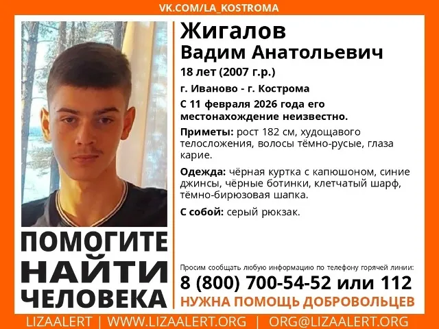 В Костроме добровольцы поисково-спасательного отряда «ЛизаАлерт» присоединились к поискам Вадима Жигалова, молодого человека 18 лет, который исчез 11 февраля. Существует вероятность, что пропавший может находиться как в Иванове, так и в Костроме.