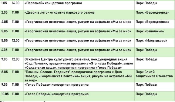 Кострома готовится к майским праздникам, предлагая жителям и гостям города множество мероприятий. Дирекция городских парков разработала обширную программу развлечений, детали которой можно найти ниже (6+)